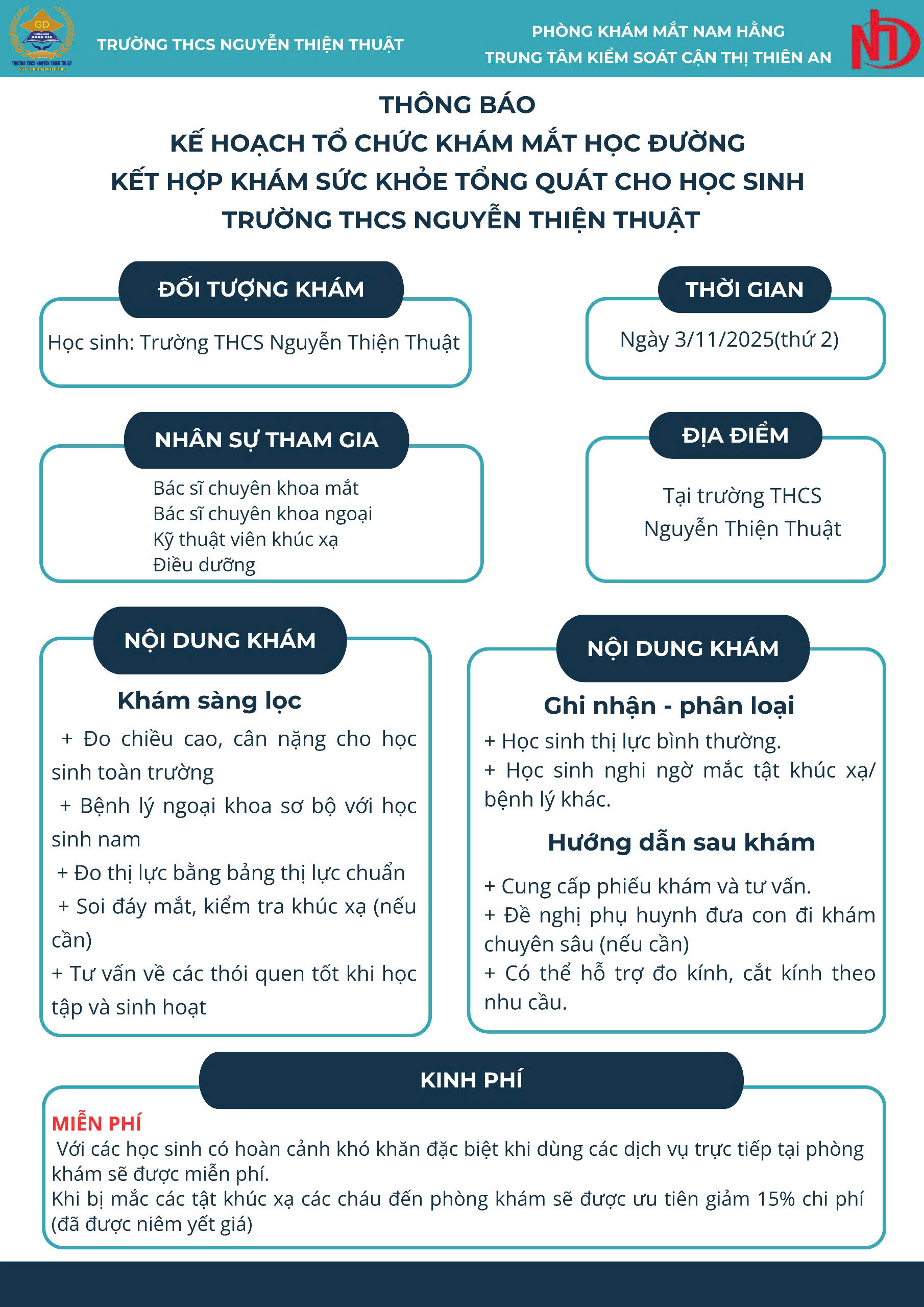 " Thông báo về kế hoạch tổ chức khám mắt học đường kết hợp khám sức khỏe tổng quát cho học sinh Trường THCS Nguyễn Thiện Thuật. "